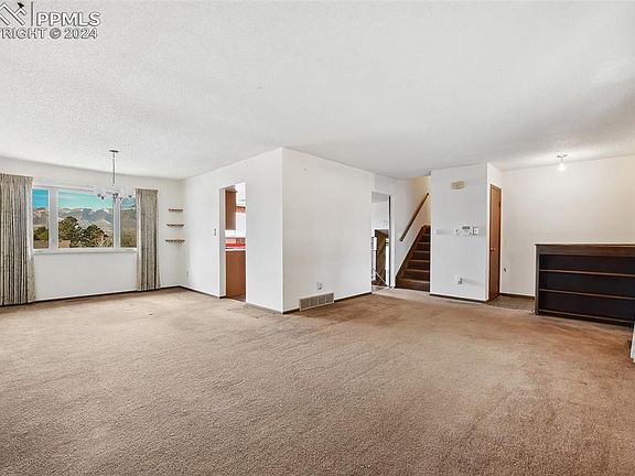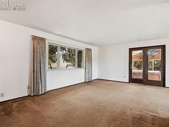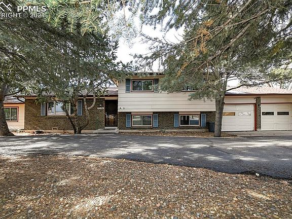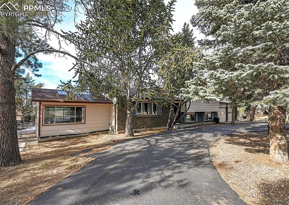 VIEWS!! Incredible Opportunity in this D20 distressed property on an acre with attached AND detached garage in wonderful Falcon Estates. AND THE VIEWS!! Attached Sun room with hot tub, brick flooring, skylights and VIEWS is not part of the home's square footage! Koi pond and paths still have expensive perennials, and could be restored to its former glory! Three bedrooms up and one down off of walk out family room with brick wood burning fireplace. 2023 roof with leaf guards. Mature trees and shrubs. This hidden gem of a quiet friendly neighborhood with homes on acreage is conveniently located just northeast of Woodmen and Academy, was formerly horse property. Property is being sold As-Is Where-Is. Fix and flip or work on a dream home!