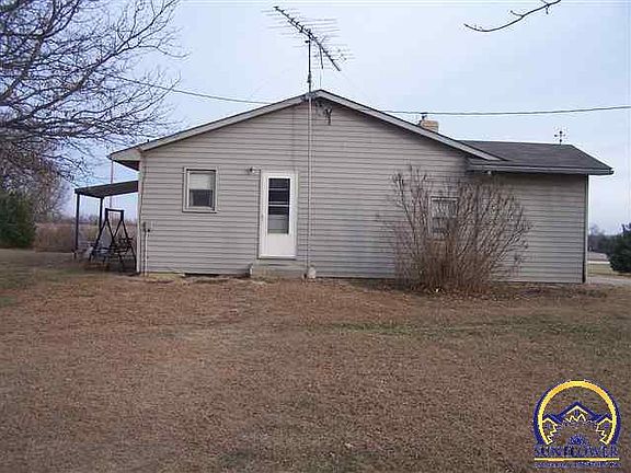 Cozy 2BR 1 BA home has full unfinished bsmt for more living area if needed. Updated FP and chimney, roomy open kitchen to DR w/great country view to the back. Covered patio off DR. 2 detached single garages/shops. Wood burning stove in larger shop. Large garden area w/big strawberry beds., rural water for house, well for outside watering. Pretty neat little package! Only 6 min. from Holton. Sq. ft. is approximate. Property is non-conforming due to only 1A m/l.