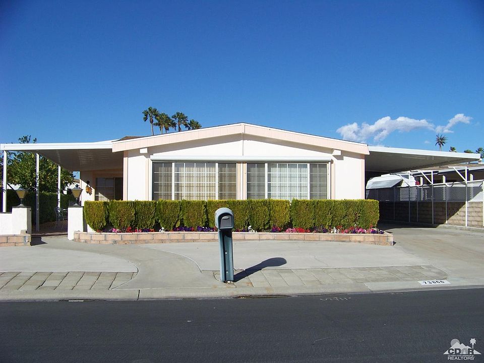 PRICE REDUCED..This charming home is located on quiet interior cul de sac street and has great curb appeal with circular driveway in front. Enjoy morning coffee on your front covered patio with mountain views. Enter the front door into living room with dual pane windows and automated roll up security screens. Upgraded home is drywalled, laminate flooring and carpets in living room & both bedrooms. New electrical service with copper wiring. New faucets in kitchen, both baths & laundry room sink. The kitchen overlooks large family room with slider to front patio. Great home for entertaining with both a front patio and large patio in backyard. This light & bright, 2 bedroom, 2 bath home comes furnished and ready to move in. Master bedroom has large walk-in closet and another slider onto back patio. Jazucci spa is being sold as is condition. A Storage Shed is included at the end of the covered carport. Landscaped backyard with orange tree. Great backyard with grass for your doggie