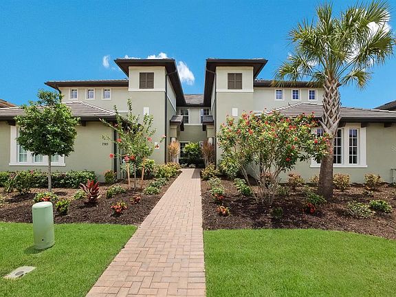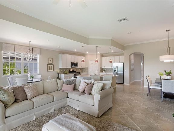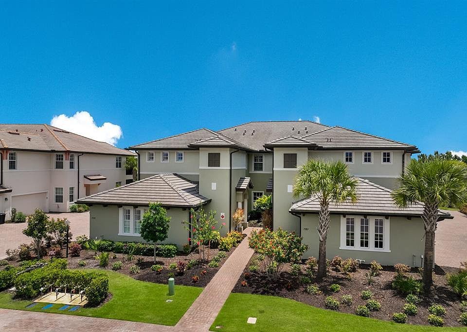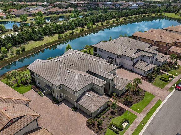 Poised to overlook shimmering lake views, upscale comfort and quality fuse to create a serene lifestyle in this Country Club East condominium. Incredibly spacious interior with a flowing open concept and tile flooring throughout, this stunning floor plan fulfills all your needs of flexibility, entertaining and gracious leisure. Natural sunlight cascades in through vast windows and glass sliders, flooding the great room with illumination, while the high ceilings with crown molding, on trend light fixtures further accentuate the home's overall neutral palette. The radiant kitchen is situated for ease and observation while preparing meals, equipped with an expansive island with bar seating for casual dining, walk-in pantry, plenty of cabinetry, quartz countertops and stainless appliances. Host events in the generous dining area before enjoying a relaxing evening opening the hurricane impact sliders to allow an indoor-outdoor atmosphere while breezes roll off the lakefront screened lanai. Added convenience comes from the upgraded laundry room with sink and upper cabinetry in close proximity to the convenient study and two guest bedrooms. Blissful privacy is met in the owner's retreat separate from the rest of the domains and boasts direct access to the lanai, an en-suite bath with dual sink vanity, and an ample-sized walk-in closet. Downstairs, the two-car garage provides covered entry and foyer, and there is even a perfect space to add an elevator. Country Club East of Lakewood Ranch is an active and social gated community offering resort-style pools, fitness center and neighborhood amenities , as well as optional golf and country club memberships all near shopping, dining, the UTC Mall and the iconic Gulf Coast beaches.