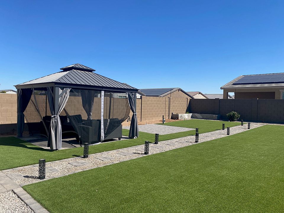 SAVE HUNDREDS OF DOLLARS ON ELECTRICITY WITH TESSLA SOLAR PANELS THIS BEAUTIFUL Freshly painted 4 bedroom , 2 bath home includes New stainless-steel appliances, open floorplan with detached island in kitchen. Washer, dryer, refrigerator, oven , microwave, and dishwasher. Huge backyard with gazebo, artificial turf, solar footlights, fairy lights, planters, covered patio with fans and Patio shades. The 2 car garage comes with Electric Vehicle Charging Station. Ring camera system included (subscription needed) Vivint camera system with doorbell and motion sensors included (subscription needed) This 2022 build is in the Quite community of Luke Landing close to Luke Air Force Base, Tanger outlets, Pizza Hut, State Farm stadium, Walmart , and Sam's club. 12 month minimum