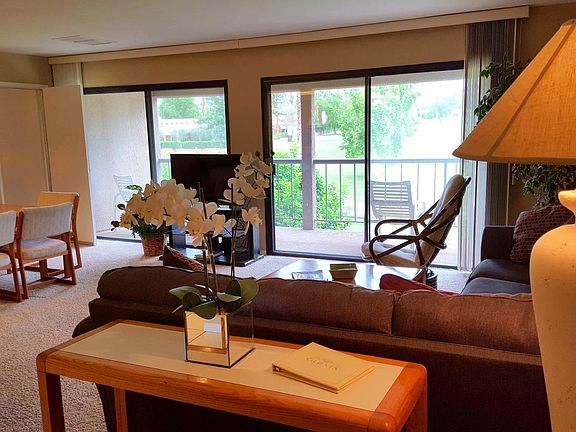 Only 6 of these units in Shadow Mountain, so now is your chance to own a little piece of paradise! Sold turnkey furnished (per inventory) & ready for you to move in and enjoy! The guestroom, livingroom, diningroom & lock off bedroom all have sliding doors that open onto their own balconies with views of the golf course and Santa Rosa/San Jacinto mountains. This unit also has 2 covered carports. Shadow Mountain Resort has something for everyone: tennis, golf, swimming, pro shop, fitness center, restaurant & close to El Paseo for shopping & dining. Quarterly HOA of $1,334.60 includes roof, exterior, water, 3 HOA pools/spas (not main pool) & basic cable TV. There is also an onsite rental office. Property is on FEE land