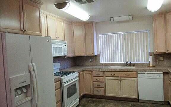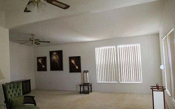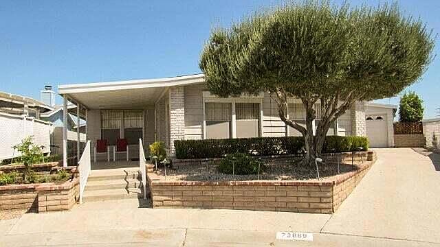This home is a must see. Enjoy mountain views from the front patio and the living area. This is a 2 bedroom home with a large master suite with the guest bedroom separated by a hallway. There is a lot of storage throughout the home including a walk in closet in the master suite and office space or a craft room adjacent. The spacious back patio area leads to the garage and is wonderful for entertaining and enjoying our desert weather. Palm Desert greens is a 55+ community with golf, trash, cable TV and wi-fi internet included in our low HOA fees of $326.00. Come see this home.