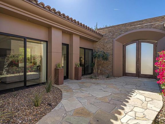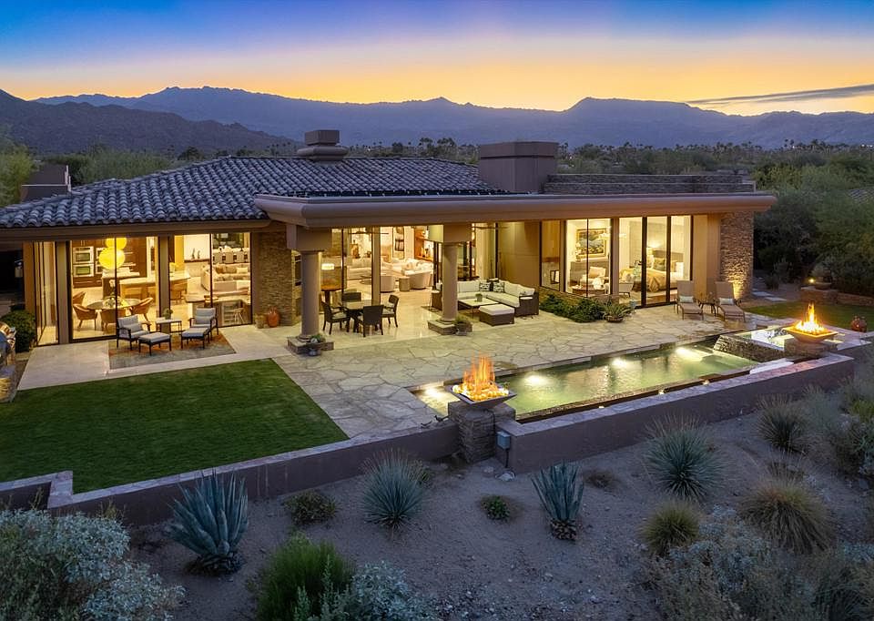 If you're looking for a private haven with every imaginable comfort, come and see all The Reserve has to offer in this contemporary custom-built home boasting breathtaking mountain and golf course views with unmatched privacy. Located on a cul-de-sac in one of The Reserve's most coveted locations, this luxurious residence spans approximately 5,345 sq. ft. The main house offers 3 spacious bedrooms, each with a private bath, while a separate guest house includes its own bedroom, living room, kitchenette, and fireplace. Thoughtfully designed for energy efficiency, this home features 48 panels of owned solar, zoned air conditioning and heating, thermal barriers, extra insulation, and tankless water heaters, keeping electrical costs minimal.The primary suite has expansive storage, and an envious custom-built primary closet. Seamless indoor-outdoor living is enhanced by Fleetwood sliding doors that stack together opening to a large backyard oasis with a pebble-finish pool, spa, misters, heaters and outdoor fireplace. Watch the giraffes gently playing in the Living Desert from your perched patio! Other exquisite details include 24-inch stone and dark wood flooring, custom window treatments, a Subzero wine cabinet, and a unique step down wet bar with a refrigerator and sink. A spacious, tiled 2-car garage with additional room for 2 golf carts, completes this home.