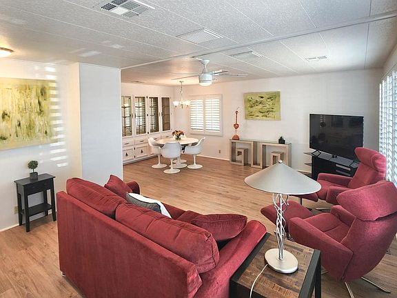 This well maintained 2 bed / 2 bath home is clean, cozy and move in ready. The LVP flooring throughout, large dual pane windows, shutters, and fresh interior paint, offers a bright and welcoming atmosphere. The main bedroom is a true retreat with generous closet space, and features a luxurious remodeled en-suite bath with dual vanity and a huge tiled walk-in shower. Kitchen has plenty of counter space, stainless steel appliances and the cabinets have been refaced including new pulls and slow close hinges. The extended covered patio is an ideal space for outdoor cooking and hosting family gatherings or relaxing with friends. For pet owners, this gem also includes a spacious gated back yard that your furry friends will love. Located on a larger lot, side by side parking and a spacious shed w/ garage door. With so much to offer this home is a great place to call home. You OWN the LAND and the low $400 monthly HOA fee includes 24/7 Guard Gated Security, Cable TV, Internet, Trash Service, FREE GOLF and so much more!