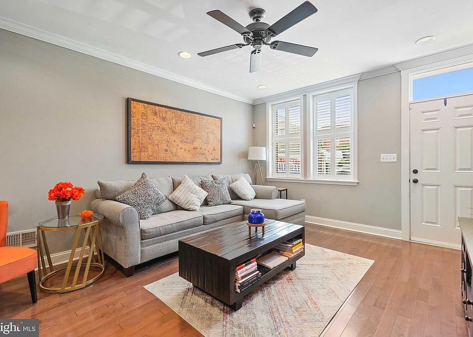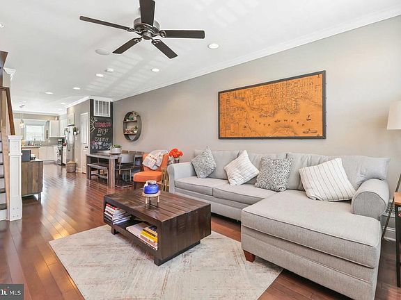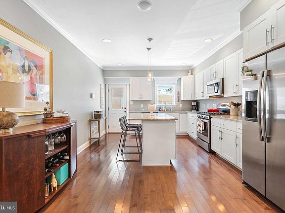 Gorgeous fully renovated 3 bedroom, 3 full bath home in Federal Hill! Entry level boasts hardwood floors, exposed brick, crown moulding, and recessed lighting. Gourmet kitchen with white shaker cabinets, kitchen island with pendant lighting and stainless steel appliances. Primary bedroom with en suite bath with stand up shower with shower heads, double vanity and two closets. Second bedroom, hall bath and access to a huge roof top deck on upper level. The basement has been fully finished with third bedroom/rec room, full bath and laundry. This MK built home is a must see!