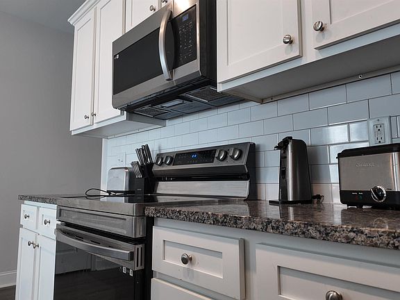Oversized garden tubStainless steel appliancesKitchen islandTile backsplashGranite countertopsWhite cabinetsVinyl plank flooring