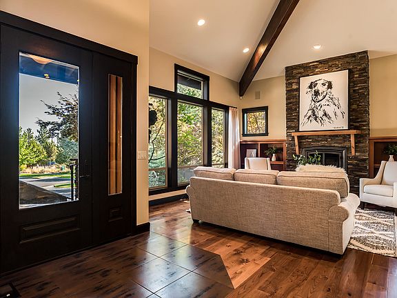 Stunning Awbrey Park 4 bedroom, 4 bath, 3292 sqft custom home situated on a .23 acre manicured home site. Inviting and open great room floor plan with hardwood floors, vaulted ceilings with exposed beams, gas fireplace with stone hearth, and built-ins is perfect for entertaining. Gourmet kitchen with slab granite counter tops, massive island, cherry cabinets, and spacious eating area with French doors to the back patio. Other main level features include a private master suite with tiled shower, jetted tub, radiant heat floors, and large walk in closet as well as a designated den/study with French doors that could be 5th bedroom. Second story offers three large secondary bedrooms and a substantial bonus room with wet bar and full bath. Entertainers will love the outdoor living space that includes a huge paver patio with gas fireplace and fenced back yard. Located directly across the street from Sawyer Upland Park and Deschutes River access trail. This is a very special property.