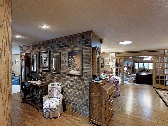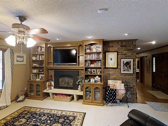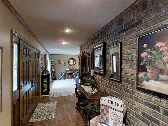 This gorgeous brick home is an entertainer's delight. It is secluded by trees for privacy on a 3.6 acre city lot. It has three bedrooms, three and one-half bathrooms, a two car garage, a salt water swimming pool, and a covered patio area capable of seating thirty family and friends and more. It is in pristine condition, and all details have been attended to. It features a small pond, and a geo-thermal heating and cooling system, to reduce monthly living costs. The kitchen is complete with large windows on two sides, abundant counter space, and a large island with a granite counter top that provides storage space within. The kitchen area has hard wood floors throughout. There is also a half bathroom just off of the kitchen. The formal dining room is next to the kitchen. It is large enough to seat a large family, and has a seating area with a fireplace, and with dining room storage. The dining area also has French doors that can be closed to offer a sound buffer from the family room. As you pass through the French doors in the dining room, you enter the family room. The family room has an attractive engineered floor with ceramic tile around the perimeter and carpeting on the remainder of the floor. This room is approximately twenty-four feet square, complete with a dry bar, to host those special sporting events with special people. There is direct access to and from the garage, and to and from the covered deck and pool areas from the family room. The family room is accented by a fireplace and a TV above it, providing the room's focal point. The living room also features a fireplace, with a custom built entertainment center around it. There are large windows on two sides of the living room, allowing the outside to enter and to be enjoyed by all. Just down the hall from the living rooms are three bedrooms. The master bedroom is large and spacious, with a window view of the covered deck, and swimming pool. The master suite also has a door directly to deck and pool areas. As part of the master suite, the large bathroom has a whirlpool tub, separate shower, and double sinks. The washer and dryer are also located in a separate room in the master suite bath, along with a third sink, the water softener, and the "on demand" hot water heater. One of the other bedrooms has a sink in it as well. The house has many other amenities such as numerous ceiling fans, fenced pool area, accent lighting, roof with a limited lifetime warranty, brick exterior, lawn sprinkler system and water well, healthy and growing landscaping, power garage door openers, external generator hookup, security system (requires service contract), pool maintenance equipment, and a geo-thermal heating and cooling system with backup gas furnaces. There is also "safe space" in the crawl space in the event of inclement weather, and storage space throughout. This home has many additional amenities that have not been discussed, and one needs to view this home to appreciate all of the qualities and details in this elegant home.