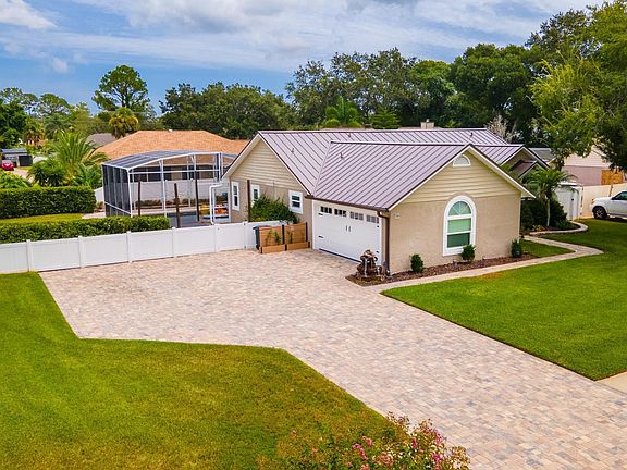 Discover the epitome of luxury living in this immaculate Port Orange pool home! With contemporary upgrades galore and an expansive outdoor entertaining space, this home is sure to impress! Step inside to the remodeled kitchen with quartz countertops, touch faucet and an island with built-in microwave. The living room is spacious and inviting, highlighted by a beautiful floor-to-ceiling brick fireplace and skylights with remote blinds. Step through impact sliding doors (2020) into your expansive outdoor oasis, complete with pavers and vinyl fence with lighting creating incredible ambiance for your family gatherings and pool lounging. Screened-in pool was resurfaced (2016) and has new variable speed pool pump (2024). Luxuriously remodeled bathrooms offer quartz countertops and digital shower display. Peace of mind provided with the new metal roof (2023), impact windows/sliders (2020), 18 Seer Heat Pump A/C (2018), garage mini split A/C (2020), impact windows and sliding doors, insulated garage door (2020), upgraded sprinkler system to reclaimed water (2018), electrical panel with generator hookup (2022), recessed LED lighting, RO water system and alarm system. Three bedrooms all include built-in closet organizers.