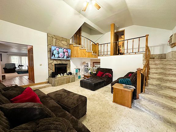 Step inside to find a bright, open layout with plenty of room for gatherings, entertaining, or simply relaxing. The home features multiple living areas, a large kitchen, and cozy touches that make it ideal for family living. Upstairs, the wraparound balcony is the perfect place to enjoy your morning coffee while soaking in the views. Outside, you'll find a detached 3-car garage plus a shop with two oversized carports.