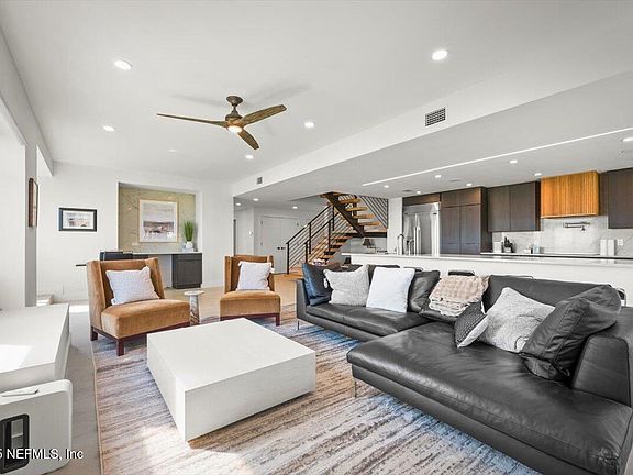 Inside, the home features contemporary coastal decor, clean architectural lines, and the comforts of modern living. A state-of-the-art kitchen includes LED accent lighting, a pot filler, barstool seating, and premium appliances. Two fully equipped kitchen and distinct living spaces allow for seamless entertaining or quiet moments of retreat.