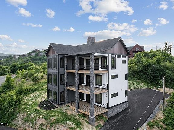 Designed with Chip & Joanna Gaines style in mind, this NEW CONSTRUCTION Industrial/Farmhouse style Cabin is located in the highly sought-after Chalet Village North! Homes like this don't come along often with BREATHTAKING UNOBSTRUCTED PANORAMIC VIEWS of Mount LeConte, Sugarland, Clingmans Dome and many others. Lots of room for family & friends in this 3600sqft cabin with 5 BR's, 5 full baths with tiled showers, 1 half bath, spacious theatre room, and 3 levels of outdoor living deck space. With 3 bold living spaces, the style of this open floor plan is incomparable to any other on the mountain and less than 5 minutes to downtown Gatlinburg. Step through the front door & you will be wowed with the phenomenal view through the oversized PELLA luxury windows and smooth sliding doors in each of the living spaces, exposed beams & the jaw-dropping massive, stacked stone gas log fireplace. This cabin was designed with impeccable taste. There were no spared expenses with the construction of this home. It is not your average home on the mountain! The Gourmet Kitchen has solid wood custom built Cabinets, Custom Color with hand distressing, Custom-Made Hood Vent, Soft Close Doors & Drawers, Granite Countertops, Crown Molding, Heavy Textured Handles/Knobs & Under Counter Lighting. The kitchen island can seat 6 people to enjoy your morning coffee or play a game of cards with friends & family. The main level large Master en-suite has a timeless designed bathroom with custom tile walk-in shower with glass door. There are 2 Bedrooms on second level, spacious game room / living space, one features en-suite with tub and tile surround and the other with all tiled shower, and spacious laundry room. Lowest level had easy access from the parking area that walks into the 3rd living space or game room, theater, huge bath with custom tile shower and glass doors, 2 bedrooms and an additional full bath with tile shower. Craftsman style interior & exterior doors. Luxury engineered flooring, super nice custom-made handrails thru-out. Unique light fixtures thru-out, huge ceiling fan, LED recessed lighting, Hardy board & batten cement siding. Whether you are looking for your DREAM VACATION HOME or an INVESTMENT PROPERTY, this home is it, visitors will love this cabin, the feeling they get when they share time together here and most of all, they'll LOVE THE VIEW, you can't find this view just anywhere! This opportunity rarely presents itself to own something at such a high caliber cabin in Gatlinburg. Very close to all the action, located in Chalet Village North, the clubhouse is only seconds away. Community amenities including access to community pools, tennis courts, clubhouses, etc. Drone Photography used. Video Walkthru: https://tyler-fraser-real-estate-photography.aryeo.com/videos/c4fef81b-0570-4321-ba8c-d06e3fcb109f