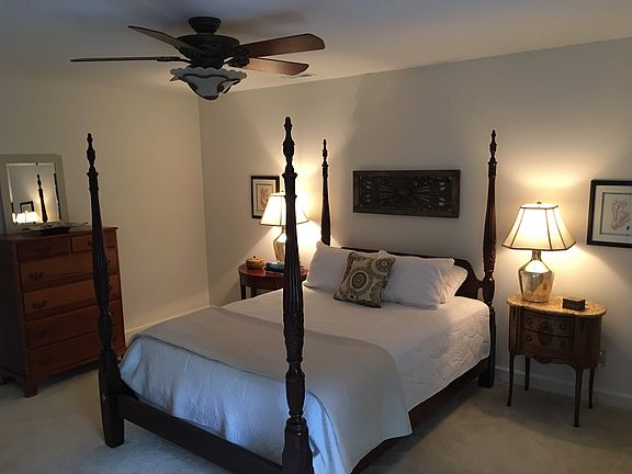 Gorgeous, move-in ready end unit townhome w/1st floor master and 2nd floor master. Conveniently located in popular Weathersfield Place, 4 bedroom floorplan allows owner to choose btwn downstairs or upstairs master! Updated kitchen with white cabinets, custom center island, granite/marble counters. Other features include 9ft ceilings, spacious room sizes, hardwoods, masonry fireplace, office/sunroom, & updated baths. Outdoor space has detached storage and tranquil private deck. Great walkable neighborhood with community pool!