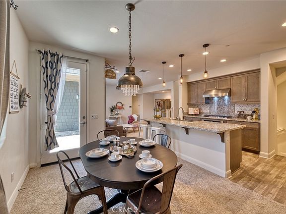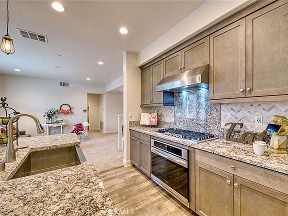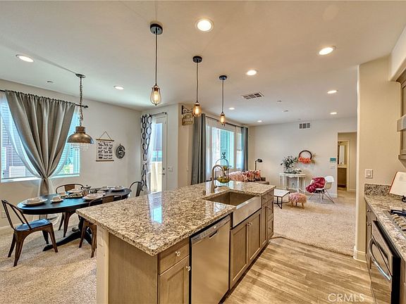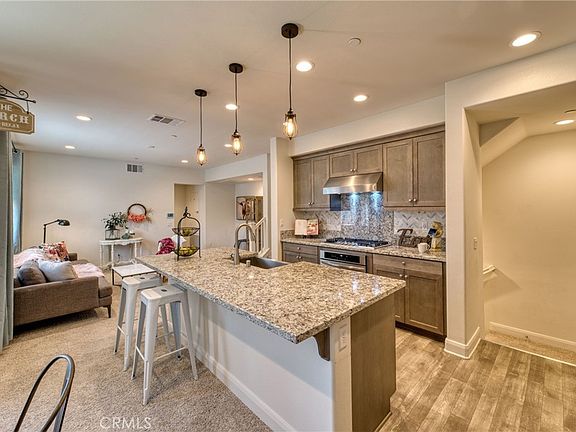 Located in the desirable Day Creek Square community sits this attractive tri-level townhome. The main level had an entry area, bedroom with attached patio, a bathroom and access to the two car garage. Ascend the stairs to the main living area which features a spacious living room, dining area, a kitchen boasting stainless steel gas cooktop, oven, range hood, dishwasher and microwave, granite counters, ample cabinetry and an oversized island with apron sink and bar seating for 4. There is a bedroom, bathroom and access to a patio. The third level houses the primary bedroom and adding bathroom with a dual sink vanity, soaking tub, separate shower and walk-in closet. Just outside the primary bedroom there a loft area that is ideal for an office and opens to the large upper patio. Community amenities include pools, spas, dog park, picnic areas and Bocci ball courts. Located in proximity to Victoria Gardens shops, restaurants, movie theater and freeway access.
