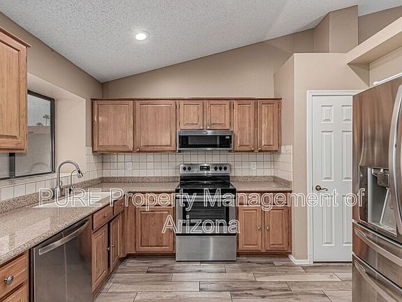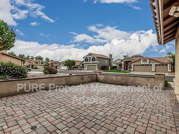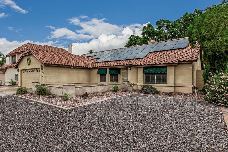 Welcome to your warm and inviting Arrowhead Ranch retreat! This energy-efficient home offers charm and comfort with a 2-car garage, easy-care landscaping, and a cozy front patio. Step inside to discover bright, open living spaces featuring a sunken living room and a family room with a welcoming fireplace. The kitchen shines with stainless steel appliances, granite counters, and a sunny bay-window breakfast nook. Vaulted ceilings, plantation shutters, and wood-look tile add timeless appeal. The spacious main suite includes dual closets and a relaxing bath. Outside, unwind in your private backyard oasis with a covered patio, lush synthetic lawn, and sparkling pool. Move-in ready!