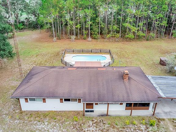 A 3/2 POOL concrete/block home on 11.25 acres with a small seasonal pond!! You'll see when you pull into the driveway just how gorgeous this property is!! A long driveway to the home, so you are far off from the road and private! Beautiful old live oaks border the home and the land is cleared all around the house, but there are enough trees to make it even more private. Fencing on 3 sides of property. The border of the property has income-producing maturing pine trees for pine needles and timber cash crops! There is a screened-in porch just off the carport, another screened-in porch in back of the home and a beautiful deck out back by the newly re-done tile pool! The living room has a fireplace and large plate glass windows so you can see your horses, chickens or whatever animals you'd like to have on your 11.25 acres! The laundry room is just off the kitchen and the carport door in a separate room with a utility sink. You're close to all the area springs, boat ramps, and outdoor living in Florida!