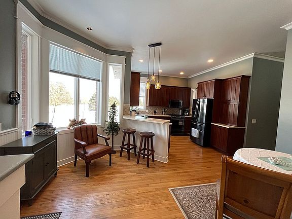 A stunning Brick Ranch Estate. The 5 bedroom 3 1/2 bath executive home on 30 acres has much to offer. The main floor showcases 10' ceilings; 3/4'' oak floors throughout the kitchen, dining and living rooms; 4 of the 5 bedrooms have walk in closets; the master bedroom suite has 2 walk in closets, plus a dual vanity and jet tub in the private bath; brick fireplace in the large living room; a 4 season sunroom. The 5th bedroom/bonus room with its own huge walk in closet is above the garage, but accessed from the kitchen area. In the basement you'll find ample opportunities to play or entertain with 2 rec rooms, an exercise room, full bath and lots of storage. Additionally, an attached 3 stall heated garage, newly huge 40x78 pole barn insulated and heated, also with lean-to’s New 40x60 Ag barn with horse/cow stalls. Heated automatic water feeders for livestock. Acreage is 50/50 woods and alfalfa pasture. 30 additional acres available