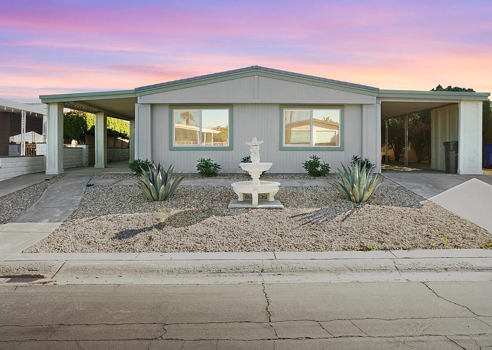 1700 Square Foot Home with split 3-bedroom floor plan! Completely remodeled throughout with new flooring, new light fixtures, new paint inside and out, new hot water heater and new roof. The kitchen features quartz counter tops and top of the line stainless steel appliances. A spacious pantry/ laundry area is just off the kitchen accented by a decorative barn door. Two bedrooms and bath are at the front of the home and the master suite is in the rear separated by the Great Room and Gourmet Kitchen. The large back patio has a view of the mountains, and the carport can accommodate two cars and a golf cart! This Desert Oasis is ready for you to just move in and begin to enjoy all Palm Desert Greens has to offer. Golf is free with ownership! Call for as tour!