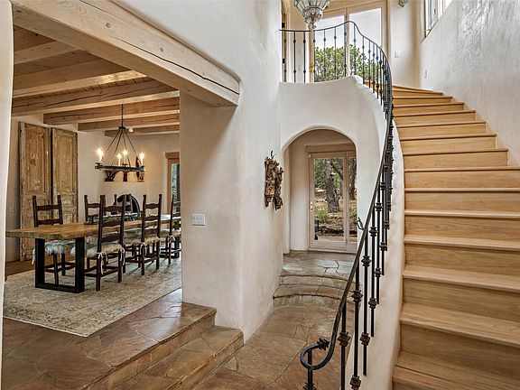 A beautiful estate located above Old Santa Fe Trail; This classic Santa Fe Pueblo style home and guesthouse are sited on nearly 6 tree-covered acres; a mere 10 minutes from the Plaza. The adobe main house has a gracious atrium entry with an elegant curved stairway leading up to a private main bedroom which enjoys a cozy kiva and beautiful views to the Jemez, city lights and surrounding mountains from a little outdoor patio. The second bedroom and a dedicated office space on the main level are adjacent to the living room which has a stately fireplace, remarkable views and high ceilings. The dining room opens to a lovely flagstone back patio and grassy area, and enjoys a corner kiva for dining by firelight. Kitchen has been beautifully updated with new stainless appliances, countertops, farm sink and opens to a grilling deck over the garage on which one enjoys the sunsets from the built in bancos. There is also a perfectly sized breakfast area adjacent to both kitchen and roof deck. Downstairs from the kitchen is the laundry area with new washer and dryer – also a great space for hobbies and is directly entered from the garage. The rastra block casita is a short walk from the house and very private, designed by Susan L. Rose, with two bedrooms, full bath with new stackable washer/dryer, one car garage and is stubbed in for a full kitchen. Currently it is a kitchenette with fridge and microwave. The living room also has a kiva and wonderful private outdoor areas. Both homes retain traditional Santa Fe details; coved ceilings, vigas and herringbone plank ceilings, oak and flagstone flooring, plaster walls, 4 fireplaces, radiant heat. Other pluses are a new roof in 2019, new water heater and boiler in both houses, new state of the art alarm system and newly redone drive. This is a bright, airy, view-filled compound that offers an income property or charming guest home for visiting family and friends!