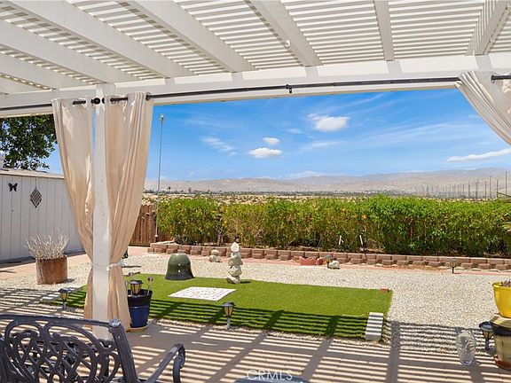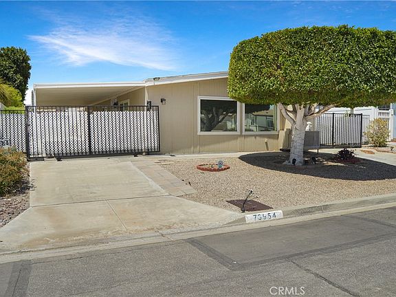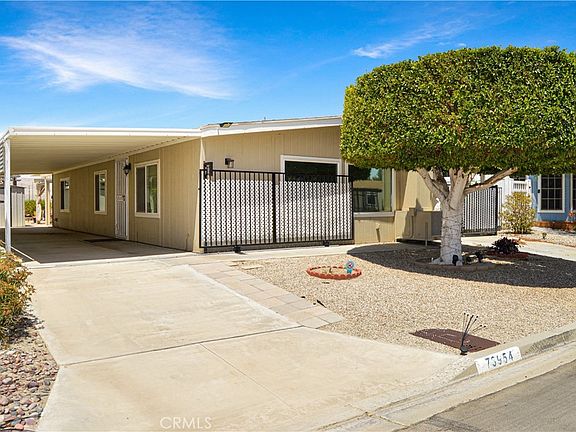 Reduced! Welcome Home to 73954 Elizabeth Drive in Thousand Palms' Popular Tri Palms Estates Community Where You OWN the Land! This wonderful place to call home is in a prime location with amazing, sweeping panoramic desert & mountain views from the spacious backyard enjoyed from multiple covered patios, features an open floorplan with thoughtful upgrades inside, & provides a golf membership for two (yes, the golf cart is now included!) in an awesome 55+ community with so much to do! Snowbirds & full-time residents alike will appreciate the gated entry on both sides of this home for added privacy & security. Once inside, you’re sure to appreciate the 7-year new heating & air; tile flooring throughout most of the home (only the 2nd bedroom & den have carpet); energy-saving dual-paned windows; updated lighting with ceiling fans in the living room, bedrooms, & den; spacious kitchen with white cabinetry, stainless steel range & refrigerator, extended cabinetry/counterspace with extra beverage fridge, stylish black granite sink & modern faucet & handy dishwasher; newer stackable washer & dryer; and the new, stunning, custom-tiled walk-in shower with Vevor shower panel system with waterfall & massage in the main bedroom suite; and drywall-style walls for that traditional home feeling! The living area is spacious with an open floor plan and great flow between the living room, dining area and kitchen. Yes, the extended kitchen counter space allows for more than one cook in the kitchen. The den has doors on both sides, so could easily be used as a 3rd bedroom if needed. The large main bedroom suite has a sliding glass door to enjoy the backyard views & easily access the covered patio spaces. Attractive security screens on the side doors allow you to enjoy those cool evening breezes. Carport covers & tall fencing along the full length of both sides of the home offer shade, privacy, & keep the interior cooler all summer long, too. The golf cart parking area is partially enclosed for added protection from the elements. The yard is furry friend approved with plenty of space for a game of fetch while relaxing and enjoying those spectacular views from under the large alumawood covers. Two large storage sheds offer added convenience and create a protected space for the smaller patio. Tri Palm Estates offers 2 fabulous golf courses, shuffleboard, tennis, pickleball, billiards, swimming pools, a restaurant, clubhouse, & many activities & clubs for you to enjoy!