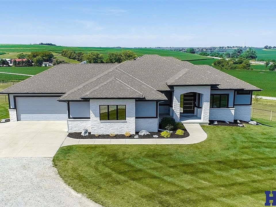 Gorgeous home on 5ac minutes from Omaha on all paved roads. This nearly new home offers quality construction, a nice layout & is fresh & modern. Beautiful kitchen with custom cabinets & quartz. The master suite has dual sinks, 2 walkin closets & leads to the laundry & oversized garage. The pantry is placed for grocery getting ease. Downstairs a movie room gives a theater experience right at home. NC 4th bed/office/fitness or hobby room offers flexibility. Pet lovers will enjoy the mud/laundry room with a tiled dog wash station & outdoor cleanup. Future family room has painted drywall on 3 sides, plus rough in for add'l bath. Outdoors, this property is ready for your pets. UGS sprinklers & a fenced areas for dogs. 3.5ac of pasture & quality horse fence lead to a 1200 SF Astro bldg. (water & electricity.) And...THE VIEWS! This property was set up & designed to showcase the sunsets & scenery that goes on for miles. From the entry to the back pasture, every angle offers a pleasing view.