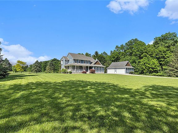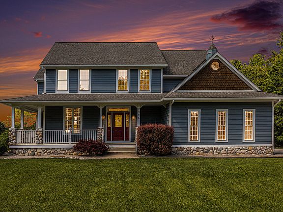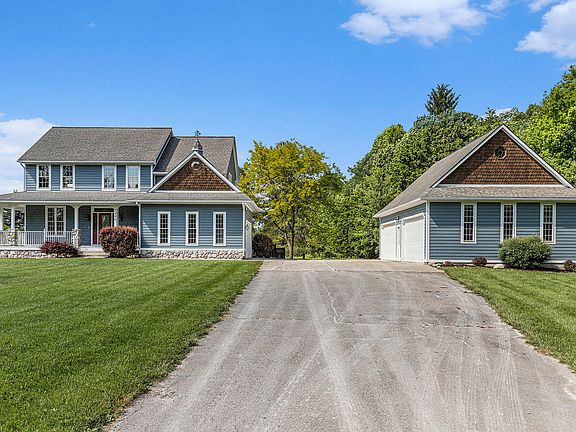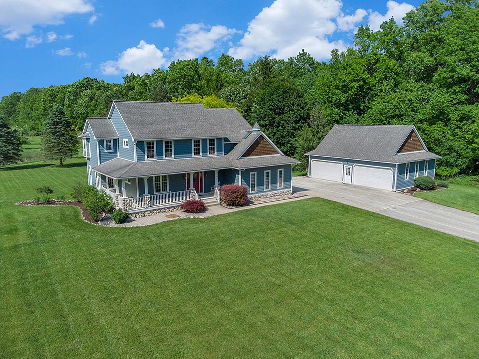 This welcoming 5 bedroom, 3 1/2 Bath Custom built home rests on a peaceful 3.9 acre parcel with a small pond and includes a 25' x 40' additional 4 car heated garage with living space above. The property is simply gorgeous with extensive Lanscaping, large backyard, and great deck. Highlights of this home include a wrap around front porch, welcoming foyer, custom kitchen with stainless steel appliances, open concept family room with hardwood floors and fireplace, Den/Formal dining room, and formal living room. The upper level inlcudes a spacious primary bedroom suite with attached bath and walk-in closet, 3 generous bedrooms, and 2nd floor laundry. The basement is finished with view out windows includes large rec room, bedroom, and full bath. You will love this home.