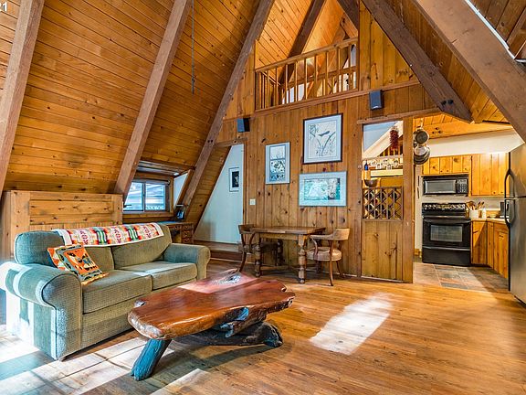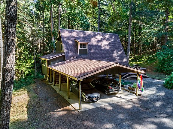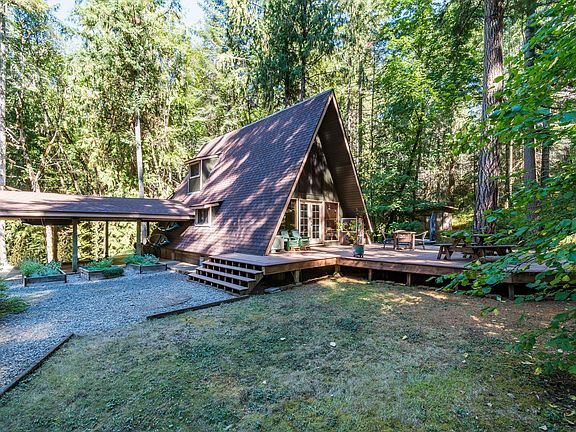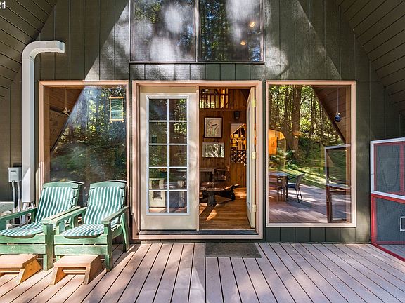 Secluded A Frame on over four private acres, just 8 miles from historic Cottage Grove. Main level features kitchen, laundry room incl w/d, bedroom (or den) with full bath, and living room with French doors to deck. Primary bedroom with 1/2 bath and walk in closet is on the upper level. Harris Creek flows through the property year round and there is a small waterfall just across the walking bridge! Don't miss the 1BR, 1ba guest quarters behind detached shop (appx 21' x 19'). No drive bys please.