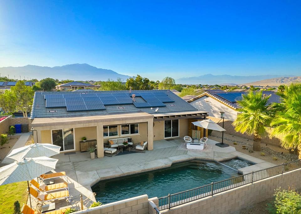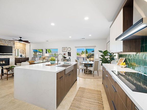 Take in sweeping views of the San Bernardino Mountains from this well-appointed, private oasis. Located in the gated community of The Gallery, this home features so many upgrades / updates, including 26 OWNED Tesla solar panels. Enter to a sunny, open living area, with a stacked stone fireplace feature wall and re-imagined kitchen. Boasting an oversized waterfall edge quartz island, designer soft-close cabinets, stunning handmade Moroccan tile backsplash, stainless appliances with convection oven& microwave, 36'' induction cooktop, LED under cabinet lighting, and plenty of storage in the new pantry with roll-out drawers... the most discerning chef will feel right at home. The primary suite has a slider to the back yard and pool, as well as a large ensuite bath with double vanity and walk-in closet. Recent updates also include: solid core doors, new 5'' baseboards, custom closets in every bedroom, high end carpet in both guest rooms, dual flush toilets, whole-house water filter and softener, RO at kitchen sink, fresh paint, epoxy garage floor and EV car charger. Recently updated laundry room with quartz counter, deep stainless sink, under cabinet lighting and LG laundry tower. Outside enjoy a saltwater pebble finish pool and spa, large covered patio, mountain views and newly added desert landscaping and irrigation. The low HOA also includes internet!