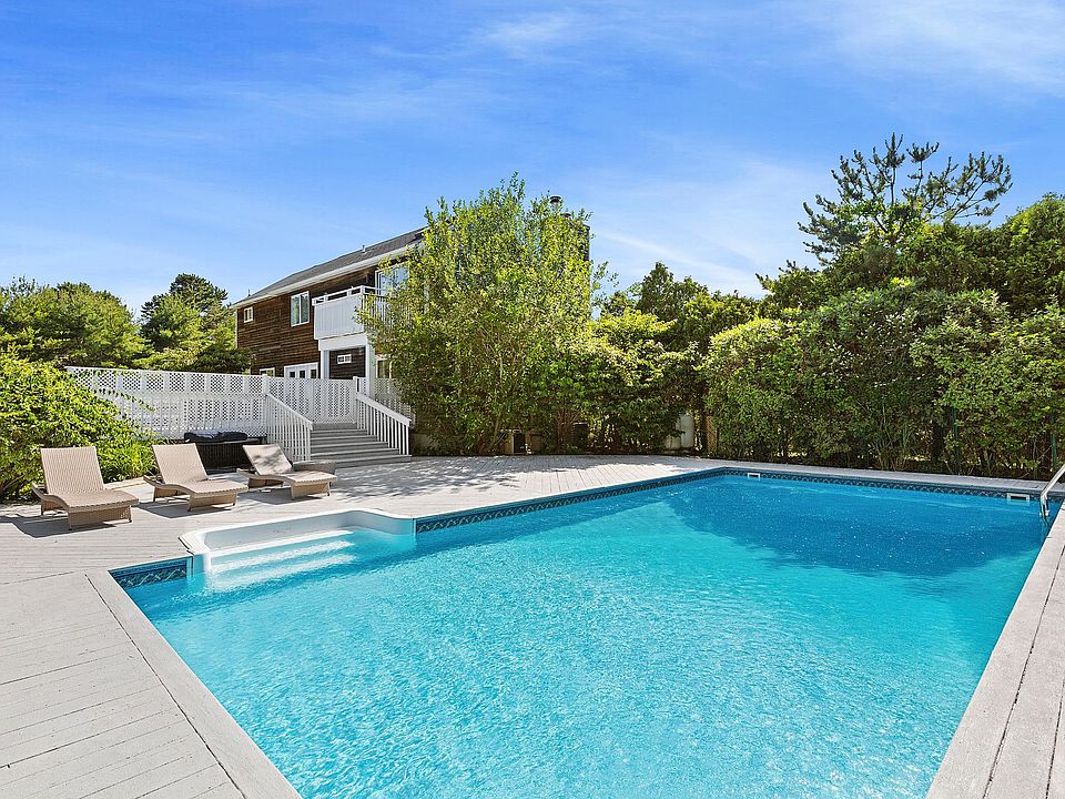 Recently renovated and freshly furnished, this four bedroom home with open floor plan is flooded with light. Glass doors open onto a spacious deck with dining and seating areas. The 20x40 pool is heated and is surrounded by lounge chairs for sunning and relaxing. A private all-weather tennis court is also part of this exceptional property. Newly listed for summer rental.