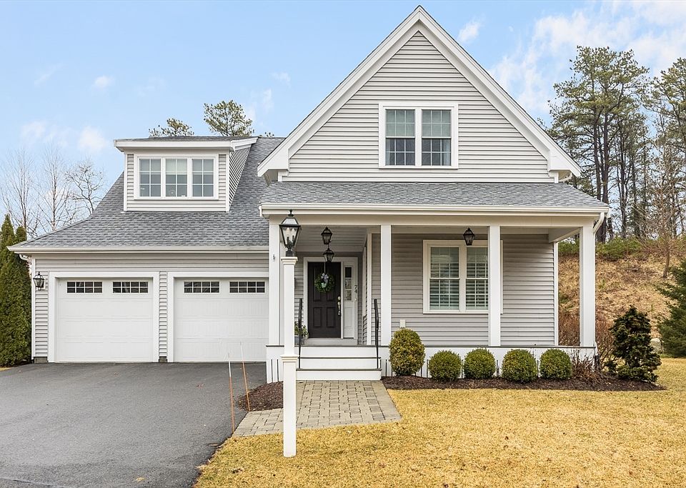 A true gem in the Boatwright's Loop neighborhood in The Pinehills. This Admiral II design is filled w/many upgraded features. The home site offers privacy w/a peaceful wooded backyard. Lovely touches shown in every room. A beautiful front porch welcomes you into a gracious foyer. Study has glass French doors, crown molding and plantation shutters. Powder room has pedestal sink, ceramic tile floor and plantation shutter. The open floor plan features a fabulous white kitchen w/spacious island, pendant lights, granite counter tops, stainless appliances, gas range, & dining area. The living room has vaulted ceilings, gas fireplace w/marble surround, recessed lights, overlooking wooded rear yard. A gracious primary bedroom suite has hardwood floors, vaulted ceiling, 2 walk-in closets, bath w/ceramic tile flooring, soaking tub, tiled shower, & double vanities. 2nd floor w/2 guest bedrooms & full bath. Plantation shutters. Whole house generator. Plenty of storage in lower level.