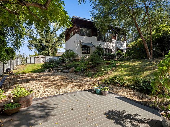 The outdoor space is wonderful! Privacy fencing encloses most of the .2 acre lot and lush garden. Stone steps lead to a large pea gravel patio, a spacious platform constructed from Trex decking, the shed available for tenant use, and a fire pit with boulder seating. Thriving plantings and shade trees abound.