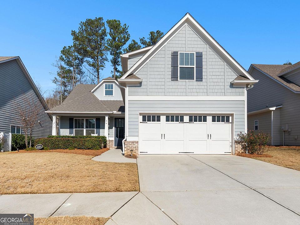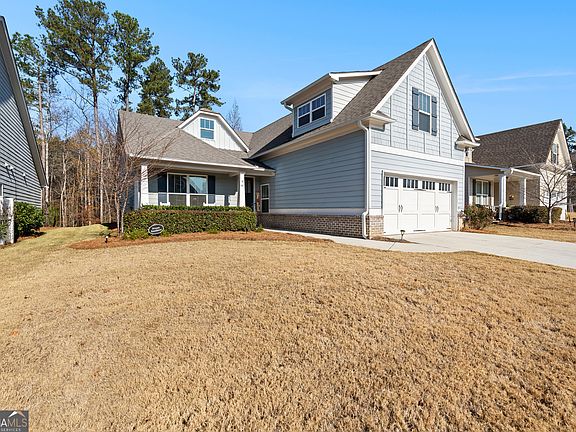 Welcome home to Heritage Pointe at The Georgian, the area's only 55+ gated community. Built in 2018 on one of the most private, wooded lots in the neighborhood, this home offers both charm and functionality. A rocking chair front porch invites you to relax and socialize with neighbors, leading inside through a glazed front door that floods the foyer with natural light. Just off the entry, a quaint space is ideal for an office or personal library. The inviting living area opens to a kitchen featuring a large breakfast island and abundant storage, while a separate dining area provides direct access to the back patio. The spacious primary suite boasts a generous walk-in closet, a bathroom with a separate shower, and a private entrance to the back patio. A secondary bedroom and full guest bathroom complete the main level. Upstairs, a large flex space with a closet is perfect for a secondary living room, entertainment area, or home office. Outside, the covered stone patio with fireplace offers a tranquil retreat overlooking the beautifully wooded, private lot. Residents of The Georgian enjoy a resort-style lifestyle, including a pool with a huge waterslide, golf cart access to The Frog Golf Course designed by Tom Fazio, tennis courts, walking trails, a private clubhouse for events, and much more. Heritage Pointe adds even more perks with an adults-only pool and clubhouse, landscaping maintenance, and trash service. This is West Georgia's premier destination for an active, elevated adult lifestyle.