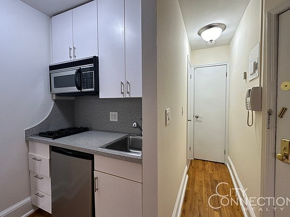 The clever kitchen area, tucked neatly along one wall, features sleek stainless steel appliances, including a mini-fridge and convection microwave/oven. There is a new subway-tiled bathroom adjacent to a convenient and deep closet.