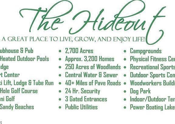 Looking to build your dream home in the country? Why not in this ''Gold Star'' Awarded, four season, gated community called the Hideout! This community boasts vast year-round amenities including lakes, boating, kayaking, beaches and pools. There's a Tiki Bar and full service restaurant/pub near the golf course! Indoor recreation center offers classes as well as indoor tennis/pickle ball courts, fitness center, golf simulator and game room. Once the weather turns, there's a ski hill and ice skating! The Hideout also offers 24 hour Security, gated entrance and so much more!