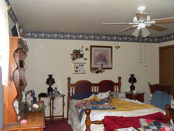 SOME CERAMIC TILE FLOORS, CAMEO OAK KITCHEN AND KITCHENETTE CABINETS WITH CUSTOM FEATURES - ROLL-OUT DRAWERS, SWING-OUT PANTRY, LAZY SUSANS, PLATE RAILS, CORIAN COUNTER TOPS,SECURITY SYSTEM, FLUE FOR WOOD/COAL STOVE, SKYLIGHT IN MASTER BATH, NEW GARAGE DOOR AND OPENER, WELL-DECORATED BATHS, EXCAVATED FOR SMALL POND AT REAR, STRAWBERRY PATCH, LARGE BACK YARD WITH SHED AND PICNIC TABLE DECK, LARGE DRIVEWAY WITH LOTS OF PARKING AREA. A FEW WINDOWS AND DOORS NEED REPLACED. MASTER BEDROOM CARPET NEEDS REPLACED. PRICE WAS ADJUSTED ACCORDINGLY.