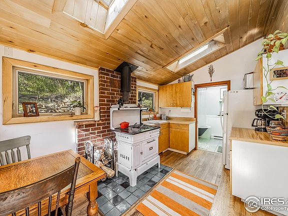 Quaint remodeled cabin for sale in the heart of Ward. This one bedroom, one bathroom cabin sits on a 0.21 acre lot surrounded by aspen trees. There is a cozy loft space with a stained glass window, and bonus office space in the front of the cabin with picturesque views of a historic church and downtown Ward. The kitchen has an 109 year old wood burning/ propane burning stove/ oven that also acts as a supplemental heat source for the home. Other features include: stacking washer/ dryer, a metal roof, detached, insulated workshop with electricity and parking area, owned propane tank, and newer hot water heater. Recent improvements include: new insulated fiberglass entry door, new energy-efficient front window, updated landscaping (re-graded for positive drainage), new front rock wall and reclaimed brick patio. Lots of possibilities for a property like this in Boulder County. Easy access to Peak to Peak HWY and only 35 minutes to downtown Boulder.
