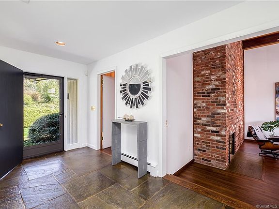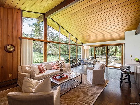 Looking for a cool, mid-century vibe? Built by the original owners and lovingly maintained over the years, this house is packed with original features and an architecturally pleasing aesthetic. With an in-ground pool on a full acre and a Long Lots address, the house lives like a ranch with all 4 bedrooms on the same living level. The family room is striking with a vaulted, wood-lined ceiling, full-height fireplace and soaring windows overlooking the mature landscaping. The open plan kitchen with breakfast bar has an eating area overlooking the wrap-around deck leading to the pool. A formal dining room and living room also feature vaulted ceilings and large windows, plus a second fireplace. There is a powder room for guests. The master bedroom enjoys far-reaching views and has multiple closets, plus a large en suite with walk-in shower, tub and double vanity. Three other bedrooms share an updated hall bathroom with shower and double sinks. Hardwood oak floors run throughout, with original slate floors in the foyer and kitchen. On the lower level, a large walk-out area with a wood-burning stove and windows is a fantastic rec/playroom or bonus room. Another finished room with built-in bookshelves is perfect for a home office or den. The full bathroom is handy for guests or a post-sauna shower. This level also boasts an oversized laundry room and storage room, plus two-car garage with work area. Come and enjoy all Westport has to offer while living in an architectural gem!