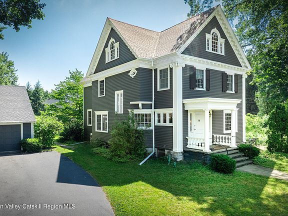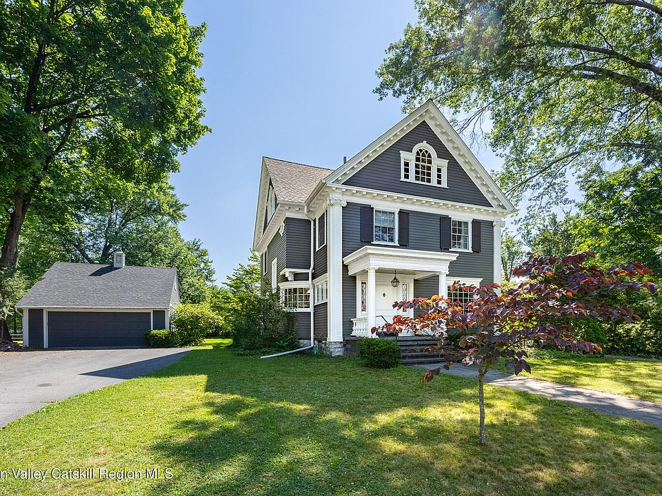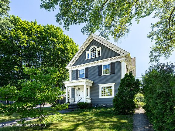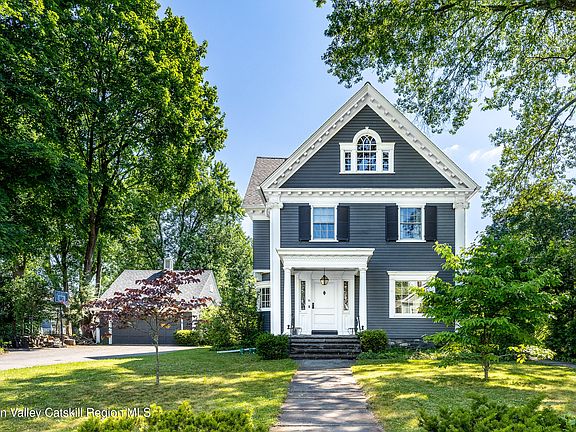 Stellar style in a coveted location: Nestled on a sprawling double-sized lot on Uptown Kingston's historic Fair Street, this remarkable side-hall Colonial Revival is not just one of the Hudson Valley's premier surviving examples of the genre, but a longtime stand-out on the stately street once known as Doctors Row. Timeless character is evident from the moment you arrive at the bluestone entry walk, and savor, up close, the classic facade with its Palladian window, ionic-capitaled corner pilasters and pristine clapboard siding, all expertly preserved. Upon entering, the ''wow'' factor only escalates, first in the oversized foyer with its grand staircase, curved side window and original built-in nook, and also in the adjoining 31-foot-long living room, bracketed by a fireplace with intact custom bookshelves on one wall and original picture windows on the others. Featuring a modern sense of openness despite their formality, these spaces flow naturally through the large dining room to a fully updated eat-in kitchen with a half bathroom and a separate rear staircase, then up to the second floor's four spacious bedrooms and two renovated bathrooms, including the en-suite primary bathroom with walk-in shower and free-standing tub. A ballroom-scale walk-up attic crowns the house, and, in the basement, a former physician's office has now been transformed into a spotless and modern accessory apartment compete with bedroom, bathroom, large open living space, fully equipped kitchen and its own private exterior entry - ideal for extra guests or rental income. Other recent upgrades include a high-efficiency zoned natural-gas IBC boiler, a newly installed roof, and ductless A/C units in both the accessory apartment and the separate portion of the basement reserved for the owners' storage needs. (If more is required, there's also a handsome 2-car standalone garage with a wood storage room and capped by its own cupola and weathervane.) Available for only the second time in more than 60 years, this house offers the rarest opportunity to enjoy intact design excellence with space to roam, both inside and out, and only minutes by foot or bike to the restaurants, galleries and shops that have made Uptown Kingston one of the hottest neighborhoods in the Hudson Valley.