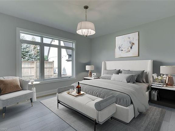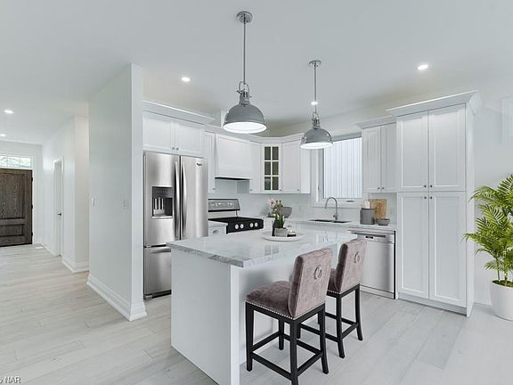 Welcome home to 74 Four Mile Creek Road in the heart of St David's, Niagara-on-the-Lake. This is an absolutely stunning 1350 square foot Bungalow. This gorgeous home brings high quality finishes. The main floor has an open concept kitchen, living room and dining area.. The custom cabinetry has soft close doors and Crown mold valance. All countertops,( Kitchen, Island, and vanities) are Bianco Carrara Marble.The living room has a contemporary gas fireplace with stunning sunset views. The master bedroom also shares this view and offers a relaxing ensuite with Bianco Carrara marble countertop,frameless glass tiled shower with glass enclosure and rain head. In keeping with the craftsman style homes in the area, custom cut 10 × 10 Douglas fir beams were installed along with other designer beams and cedar ceiling in the covered porch area. Plans have been drawn for a future family room, bedroom and bathroom.