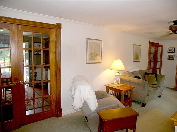 Updated Ranch Home - Large Living Room with French Doors, Kitchen w/many cabinets, newer stove ,Dining Room with door to deck, glass panels on either side of door open.