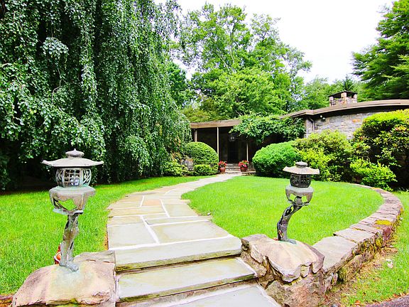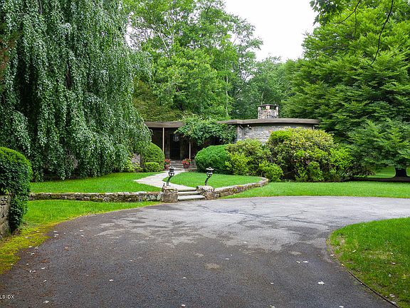 NEWLY PRICED OPPORTUNITY on nearly 8-lush pvt acres, incl 2-buildable lots, w tennis court, pool & spa, cabana, deck+patios Designed by a noted architect for his family, it's filled w architectural delights and invites you to bring your vision & make it your own Once owned by renowned Broadway composer Burton Lane, this one level stone home features curved walls, generous-sized rooms & lg windows - clearly created for impressive entertaining + wonderful living Stone pillars mark the main entry up to the circular drive at front, while a 2nd driveway, delivers you to the garage. Open living & Great rm, lg dining rm, fully equipped stainless/granite EIK, mahogany library & wet bar rm, 5BRs incl Mstr suite with fpl+sitting/ sunrm +wardrobe rm+full bath. LL has lounge/media rm+play rm. WOW