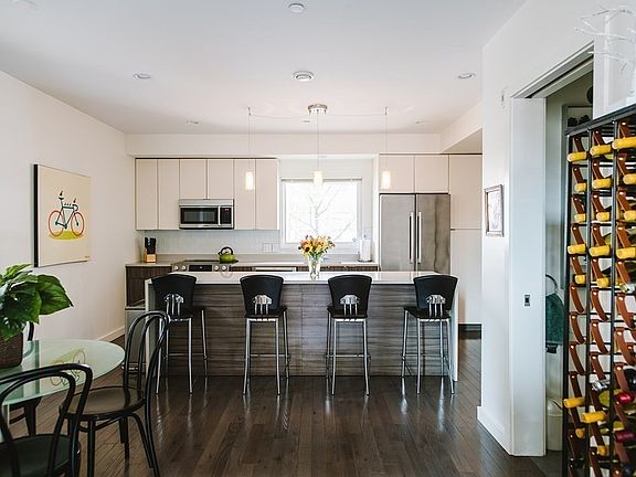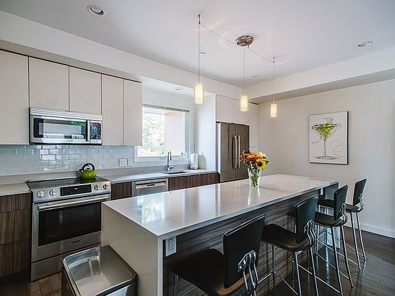 Was Temp. Withdrawn for the election. NEWLY PRICED to sell! This unique & gorgeous corner townhouse is jaw dropping from the moment you open the front door & step inside! Cathedral ceilings and large windows greet you on the first floor, with open-concept kitchen, dining, & living spaces flowing seamlessly. Dinner parties can reach new heights in this home with a private patio just outside, perfect for grilling & a sunset cocktail hour. Upstairs you'll find a streamlined master bedroom with a large walk-through closet leading to the relaxing master bathroom. The spacious top-floor bedrooms are both sun-flooded--one features a cozy deck with tree-top views, & they share another sleek, contemporary bathroom. The home is rife with additional amenities including in-unit laundry, continuous conditioned fresh air system, triple paned windows, two deeded parking spots, basement storage unit, beautiful front landscaping & garden plus solar panels