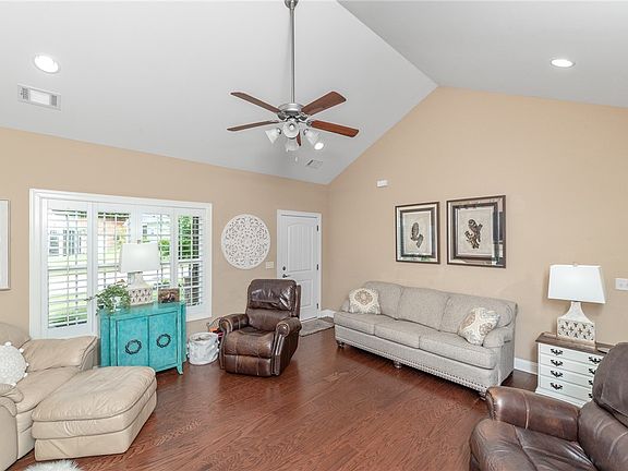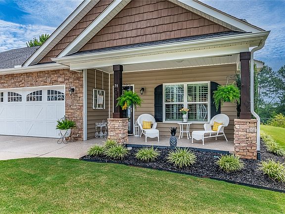 Experience maintenance-free living in a gated community with this rare opportunity in highly sought-after Crayton Hall! This immaculately maintained 1600 plus sf 3-bedroom, 2-bathroom home is loaded with upgrades and could be yours. As you arrive, notice the IronDrive coating on the driveway, front patio, and garage. Relax on the gorgeous front porch equipped with pull-down shades for sunny days. Inside, bask in the natural light of the living room featuring a gas fireplace and vaulted ceilings. Engineered hardwood floors flow throughout, complemented by carpeted bedrooms. The spacious kitchen boasts an abundance of French Country custom cabinetry, granite countertops, a tile backsplash, and an eat-in peninsula. Stainless steel appliances, including a double oven, are included. Adjacent to the kitchen, find a large dining area leading to a tranquil screened-in porch with shades and an extended patio for outdoor gatherings. The laundry/mudroom off the kitchen offers convenience with a sink and ample storage. Take a walk down the hall, discover two spacious bedrooms and a guest bathroom. The master suite is highlighted by a large walk-in closet, trey ceiling, and an expansive bath featuring a double sink vanity, large walk-in shower, and additional storage/closet space. Enjoy maintenance-free living with the HOA covering exterior yard work, maintenance, roof, and sprinkler system. Additional features include a tankless hot water heater, whole house water filtration system, and a new HVAC system installed in September 2023 with a 10-year warranty.Don't miss out on this opportunity for luxurious, hassle-free living in Crayton Hall!