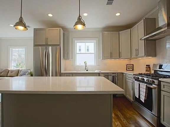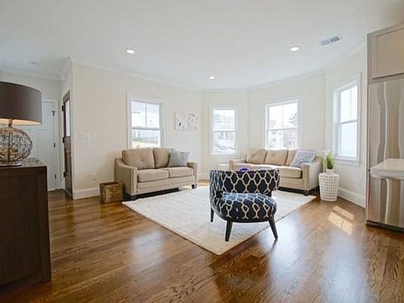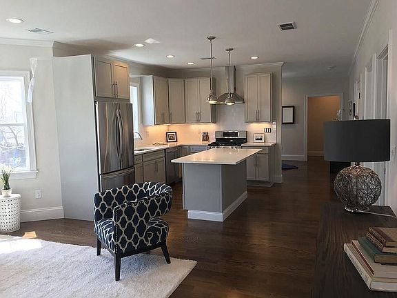 STRIKING 2017 RENOVATION! Located steps from Centre St. shopping district and walking distance to commuter train. 2,300+ sq. ft. condominium that feels like a town home on two levels of living. A complete gut renovation inside and out; all new systems: wiring, plumbing, on demand H20 & HVAC. Much thought given to design: open concept, stained wood floors, an exquisite mix of modern taste and beauty. Each unit offers a sun-filled open layout, kitchens w/ modern finishes, quartz counters, five burner gas stove, hood vent, tile backsplash, and a kitchen island that opens into your living room, wired for audio system. Bathrooms feature designer tile work, quartz vanities, and glass shower doors. In unit laundry. 800 sq. ft. 3rd level is perfect for a family room/ game/ media room or in-law suite or bed. Rear decks with tree top views and off-street parking for one car. Ready to move in!!