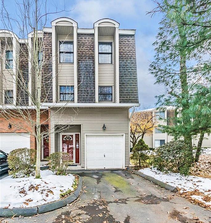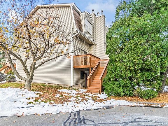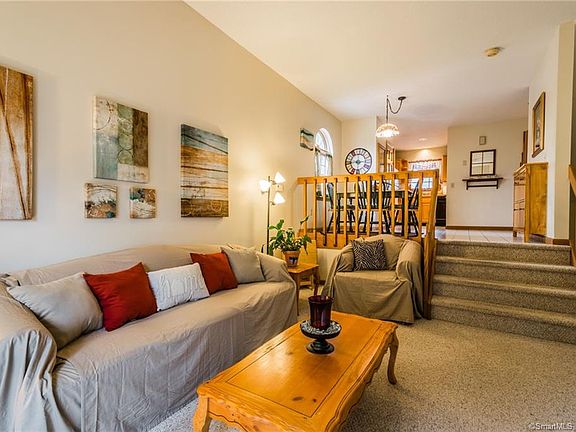 Beautifully maintained end unit with a great unique layout in a quiet community! Main level offers sun-filled living room with cozy wood-burning fireplace. Sliders lead out to a private deck with stairs that provide access to ground level. Spacious eat-in kitchen is raised giving the feel of a separate dining space while maintaining the open concept. 2nd floor includes a large master bedroom with dual closets, 2nd bedroom and full bath. This home offers central air and natural gas to keep you comfortable all year long. Take advantage of a partial basement for additional storage and a garage that many townhomes do not offer! Plus low condo fees and of course the convenience of never having to rake leaves or shovel snow! Located on the Plainville/New Britain line close to endless shopping & dining options, movie theater, parks and easy highway access! Tour this home today!