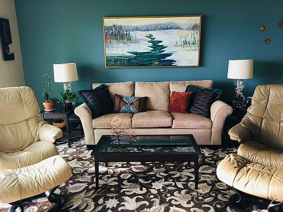 Beautiful sunsets and stunning views of Lake Champlain and Adirondack Mountains through new 12-foot sliding door. Large deck with awning. Biking and walking via the stairs to the bike path and beach. Swimming pool and tennis courts on site. Upgrades include all new windows, stainless appliances and granite counter tops in kitchen, jacuzzi tub and new stall shower in bathrooms, custom cabinets with desk in living room, solid interior doors. Detached one-car garage.