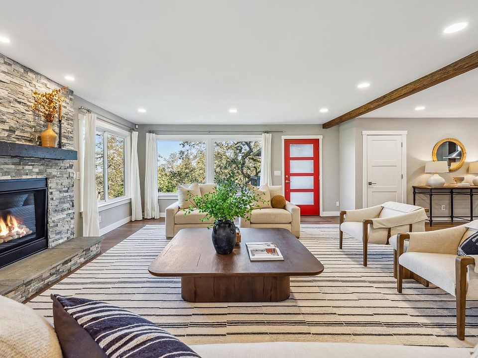 Stunning remodeled home in Los Ranchitos on 1+AC ideal for relaxed living. Enter into an open-beam great room, perfect for entertaining or family gatherings, or quiet evenings by the fireplace. The adjacent island kitchen is designed for style and functionality with space for 4 counter seats, featuring a BlueStar 6-burner range, built-in microwave, KitchenAid refrigerator, ample cabinetry, and pantry cabinet. The main living level has circle sawn fir flooring from Montana exuding warmth throughout. Just off the kitchen, you'll find a spacious full bedroom, full hall, and convenient laundry room. The large primary suite offers a luxurious bath with a soaking tub, dual sinks, and an expansive walk-in glass block shower with dual shower heads. Downstairs, a versatile family room awaits, along with a bedroom, full bath, and kitchenette perfect for extended family, guests, or additional living space. The lower level also provides interior access to the large 2-car garage, complete with extra workspace and storage. This home is bathed in natural light, offering privacy and tranquility. The expansive backyard boasts decks, a patio, and a level yard where a pool once existed, including possibilities to install a new pool, create a sport court, or designing a peaceful zen garden.