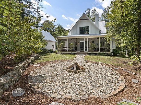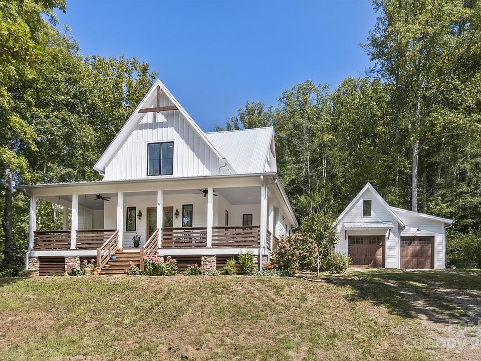 Country elegance and a world of quiet tranquility. Enjoy your coffee on one of the covered porches, while nature comes alive all around you. This home comes with over 23 incredibly private acres filled with a huge assortment of fruit trees and shrubs, yet is found just 20 minutes from downtown Asheville. Three en suite bedrooms and a bonus room, huge windows bring in the light, and a magnificent open kitchen and living room with a centerpiece of a wood stove offer all the comforts one could desire in the mountains.