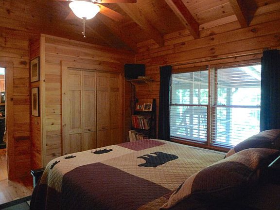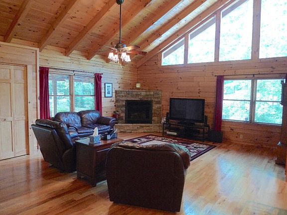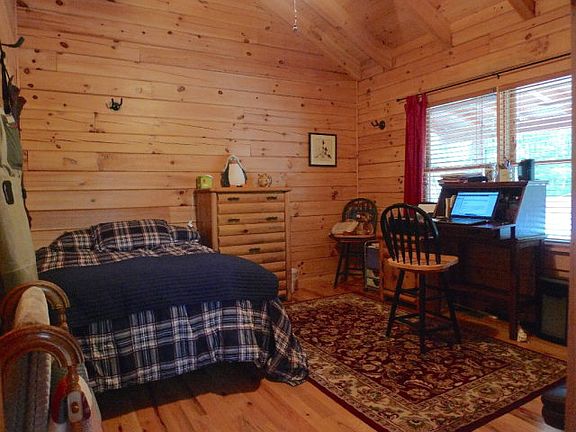 Cozy log home on private lot. Enjoy the wooded views from the covered front porch or rear screened porch. Easy to maintain, energy efficient home for full or part-time living. Open great room with cathedral ceiling, lots of windows, hardwood floors and gas, stone fireplace. Two spacious bedrooms and master has attached full bath and easy to access attic storage. Lots of fruit trees and raised garden beds. Private gated community close to Lake James and convenient to Morganton and Marion. Private road maintenance and community pool included in low HOA dues. Offered completely furnished.